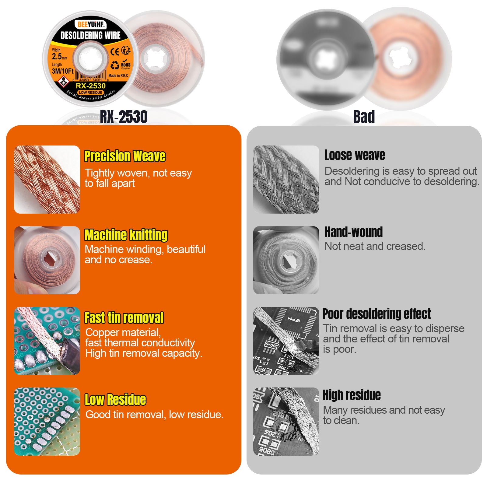Desoldering wick advantage: Refined chemical formula, resistant to oxidation and corrosion,clean tin absorption.Fast heat conduction, suitable for various electronic PCB circuit boards.