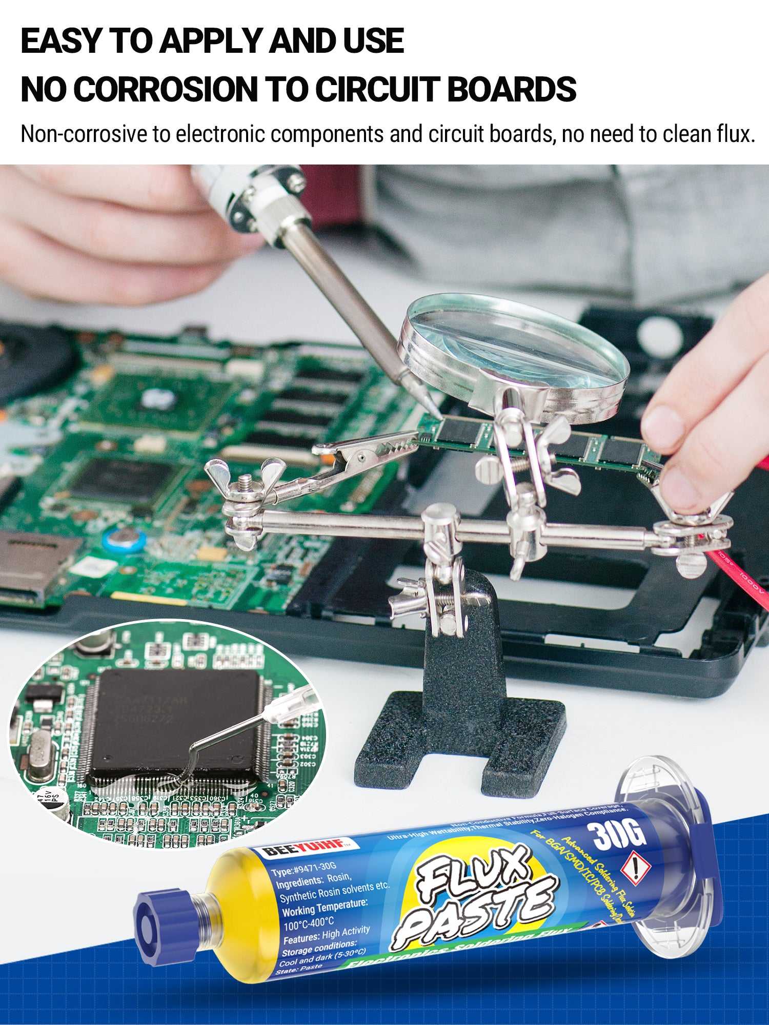 Smooth flow soldering flux paste - This flux contains rosin, which increases the adhesion of the solder wire or solder paste, and protects and prevents re-oxidization of the PCB after soldering. The resin also provides excellent retention of electronic components.