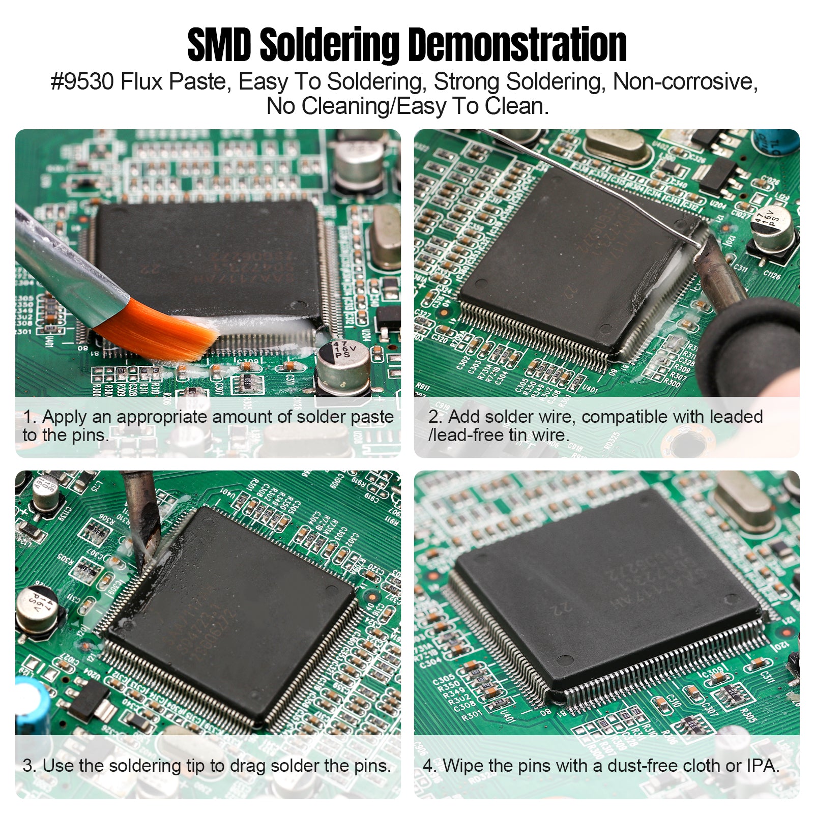 Soldering flux paste application: Mobile phone repair, computer and digital service industries, high-precision circuit board SMT soldering, BGA welding process, Maintenance drag soldering, BGA planting tin, maintenance desoldering, electronic components soldering, mobile phone maintenance, mobile phone chip maintenance, LED lighting, home appliance maintenance,etc.