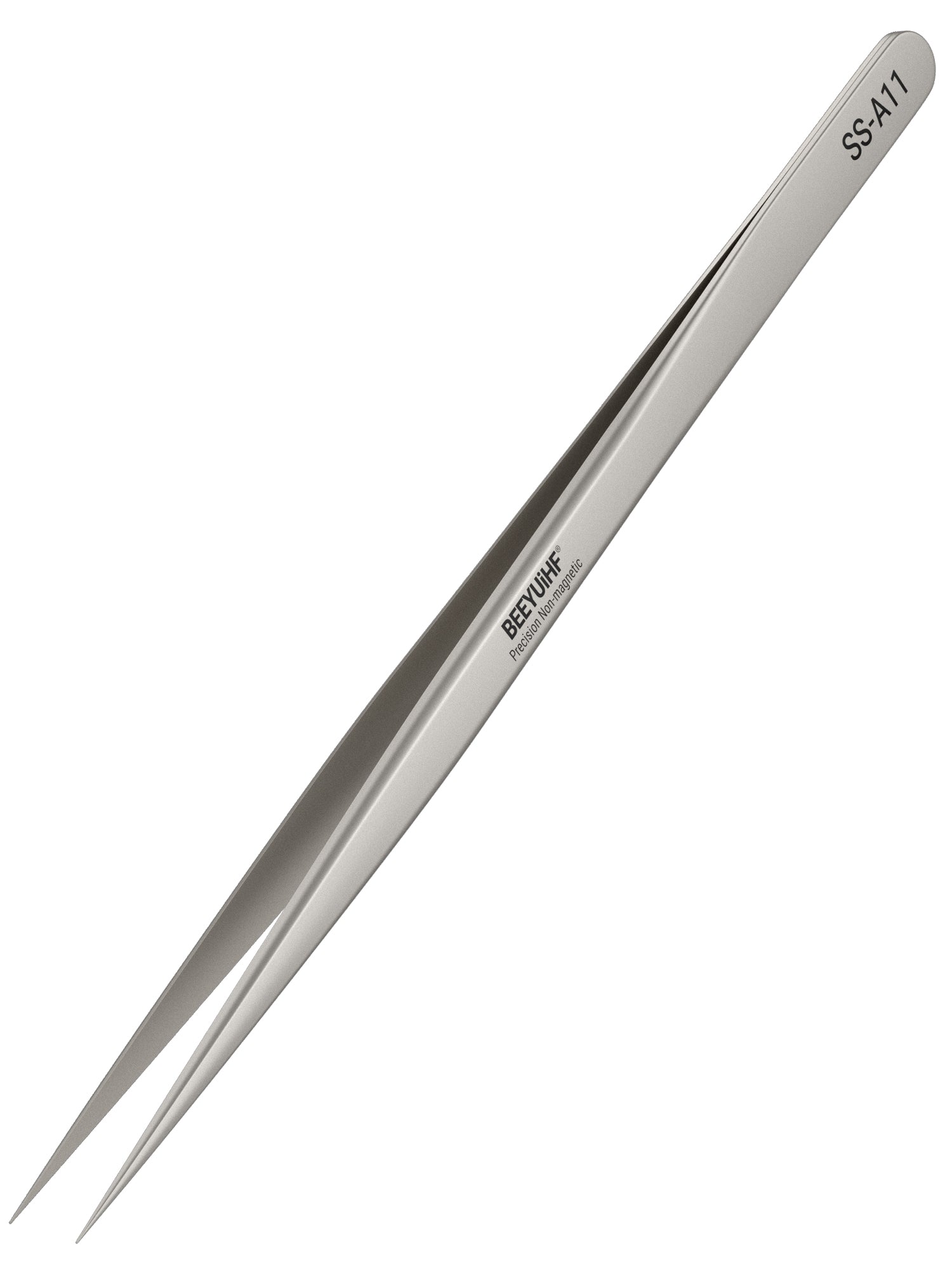 Non-Magnetic & High-Precision Tweezers (#SS-A11) Ideal for handling magnetism-sensitive items in demanding fields like Electronics, Jewelry, Medical, and Model Building. Manufactured from 302 stainless steel with a dedicated demagnetizing process to ensure a truly non-magnetic state.