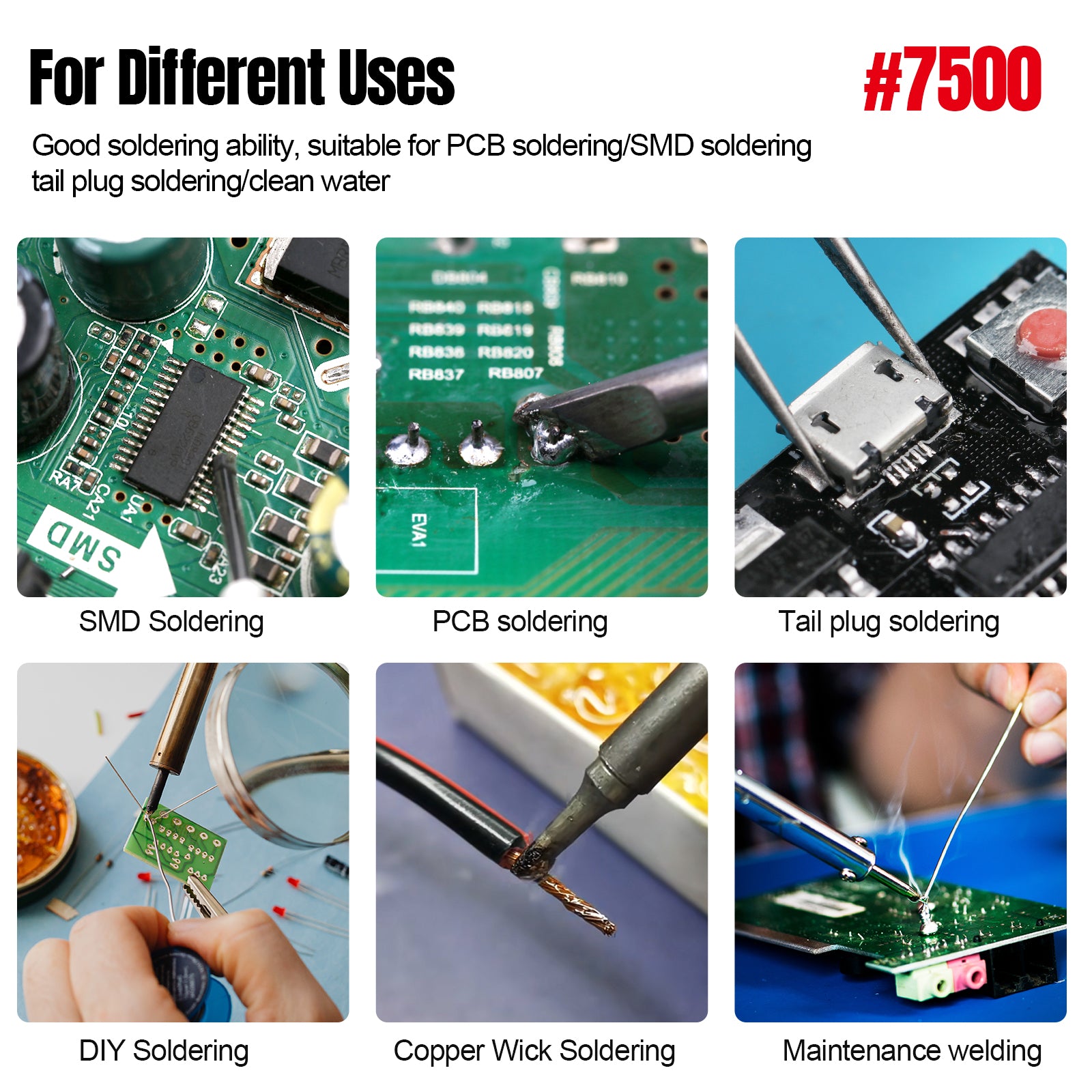 #7500 Activated Rosin Soldering Flux Paste Feature: Lead-Free/Fast Tinning/Prevents Oxidation/Excellent wettability/High tack force/high intensity joint/good insulation/good soldering properties/smooth welding surface.